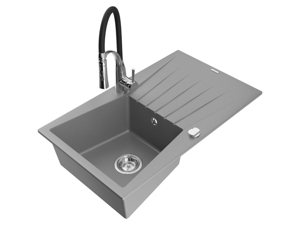 Granitový drez Mexen Cesar s 1 misou, odkapávačom a kuchynskou batériou Aster, sivý - 6514-71-73450-07