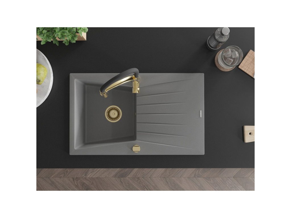 Granitový drez Mexen Cesar s 1 misou, odkapávačom a kuchynskou batériou Aster, sivý - 6514-71-73450-57-G