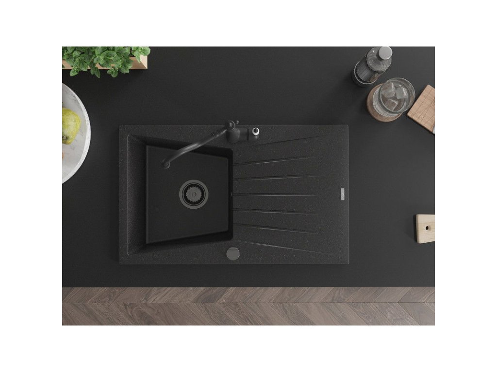 Granitový drez Mexen Cesar s 1 misou, odkapávačom a kuchynskou batériou Carla, čierna/strieborná metalíza - 6514-73-670700-70-B