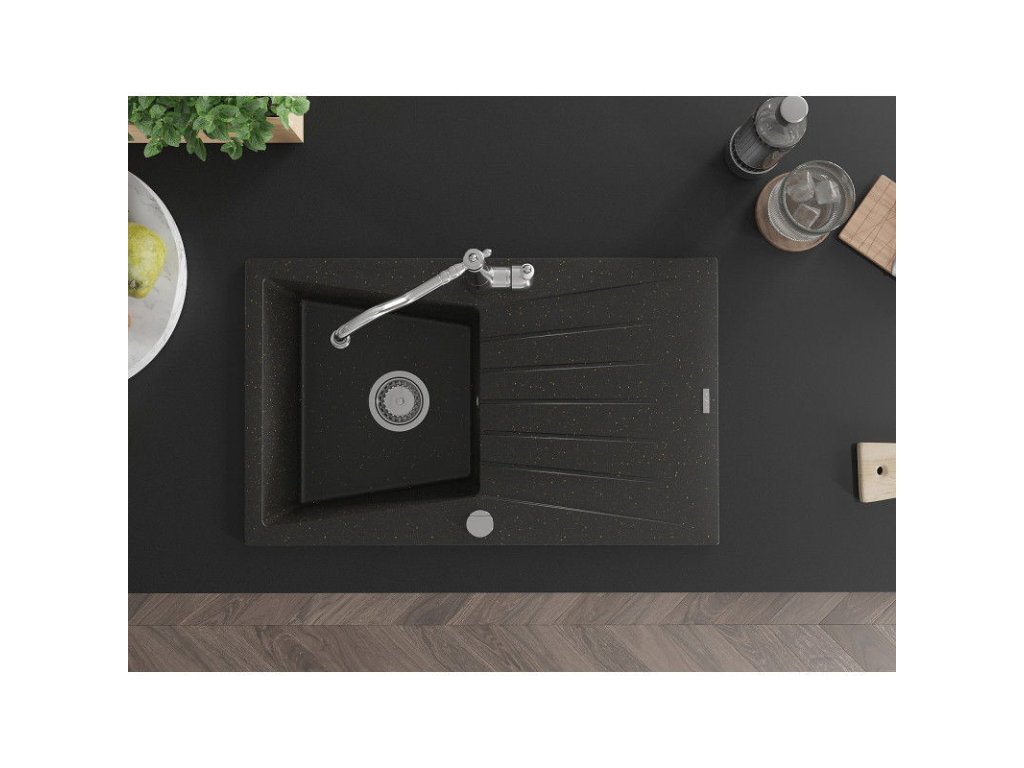 Granitový drez Mexen Cesar s 1 misou, odkapávačom a kuchynskou batériou Carla, čierna/zlatá metalíza - 6514-75-670700-00