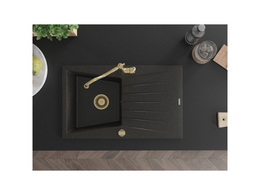 Granitový drez Mexen Cesar s 1 misou, odkapávačom a kuchynskou batériou Carla, čierna/zlatá metalíza - 6514-75-670700-50