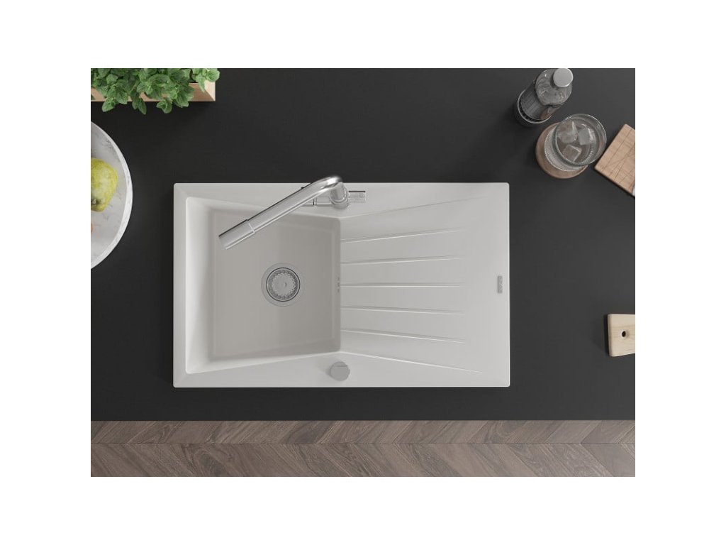 Granitový drez Mexen Cesar s 1 misou, odkapávačom a kuchynskou batériou Duero, biely - 6514-20-671600-00