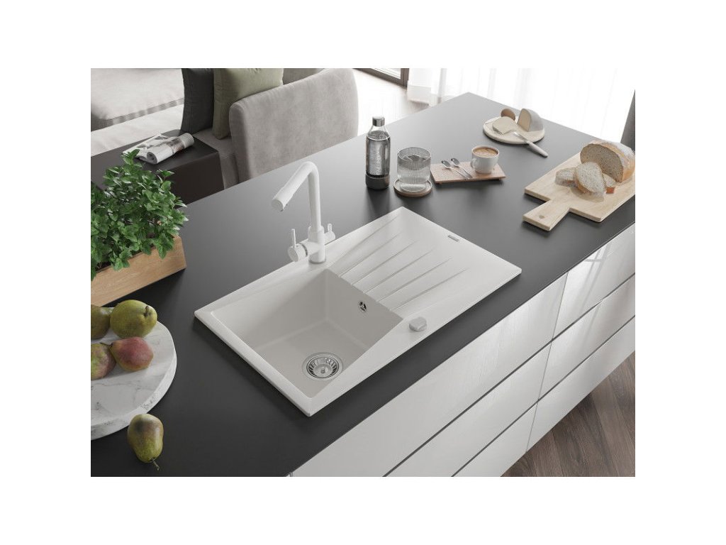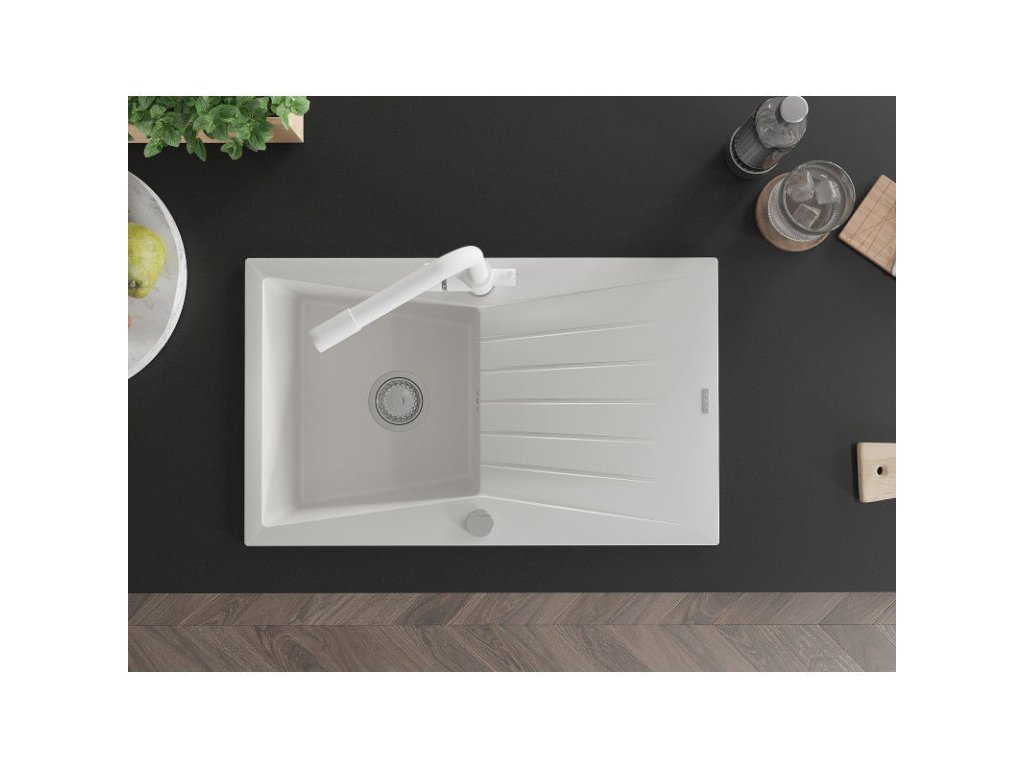 Granitový drez Mexen Cesar s 1 misou, odkapávačom a kuchynskou batériou Duero, biely - 6514-20-671600-20
