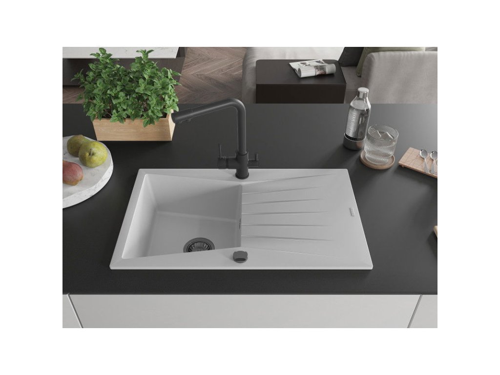 Granitový drez Mexen Cesar s 1 misou, odkapávačom a kuchynskou batériou Duero, biely - 6514-20-671600-70