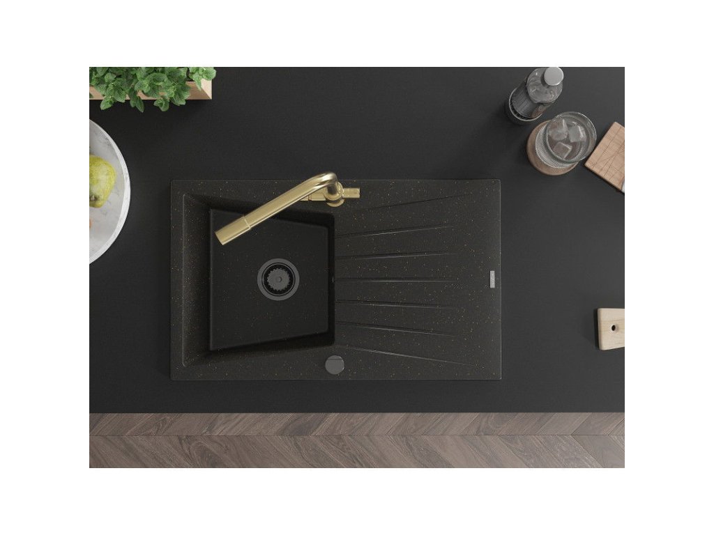 Granitový drez Mexen Cesar s 1 misou, odkapávačom a kuchynskou batériou Duero, čierna/zlatá metalíza - 6514-75-671600-50-B