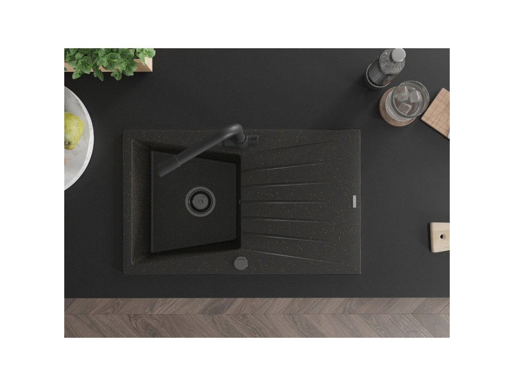 Granitový drez Mexen Cesar s 1 misou, odkapávačom a kuchynskou batériou Duero, čierna/zlatá metalíza - 6514-75-671600-70-B