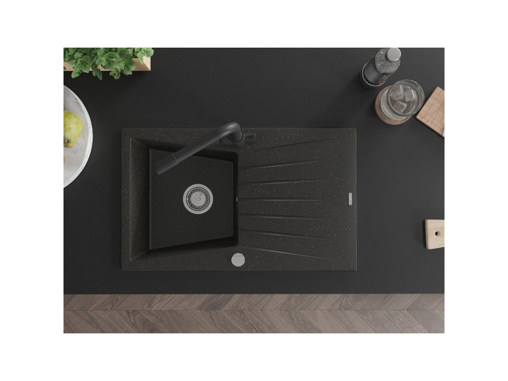 Granitový drez Mexen Cesar s 1 misou, odkapávačom a kuchynskou batériou Duero, čierna/zlatá metalíza - 6514-75-671600-70