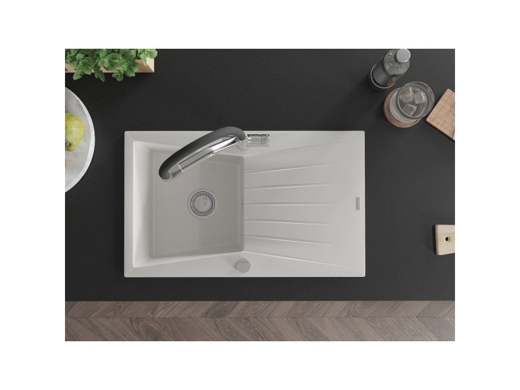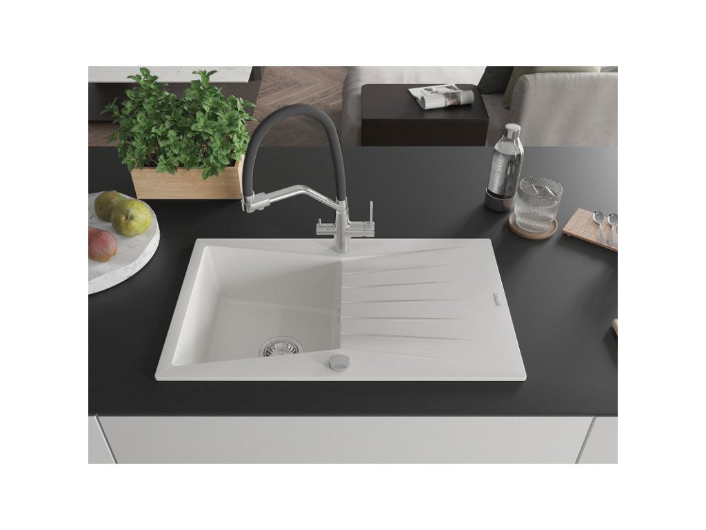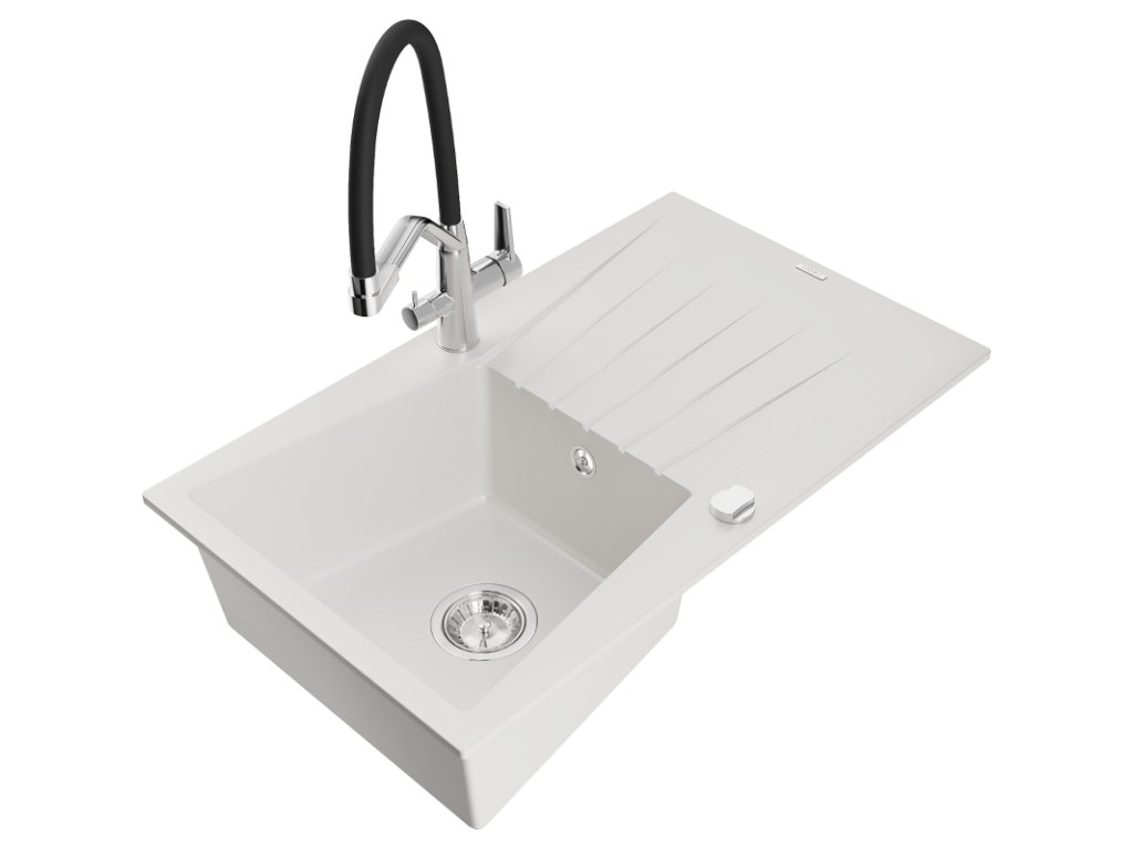 Granitový drez Mexen Cesar s 1 misou, odkapávačom a kuchynskou batériou Duo, biely - 6514-20-671701-07