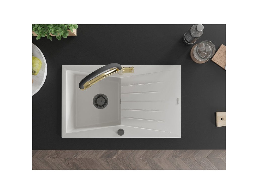 Granitový drez Mexen Cesar s 1 misou, odkapávačom a kuchynskou batériou Duo, biely - 6514-20-671701-57-B