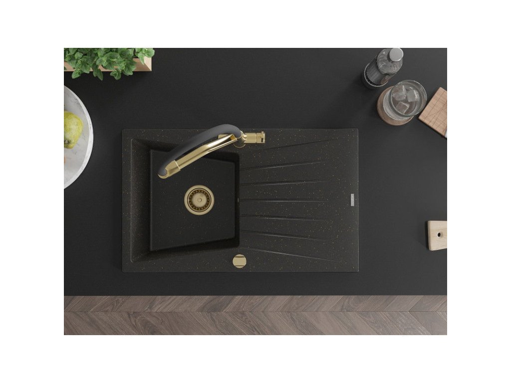 Granitový drez Mexen Cesar s 1 misou, odkapávačom a kuchynskou batériou Duo, čierna/zlatá metalíza - 6514-75-671701-57-G