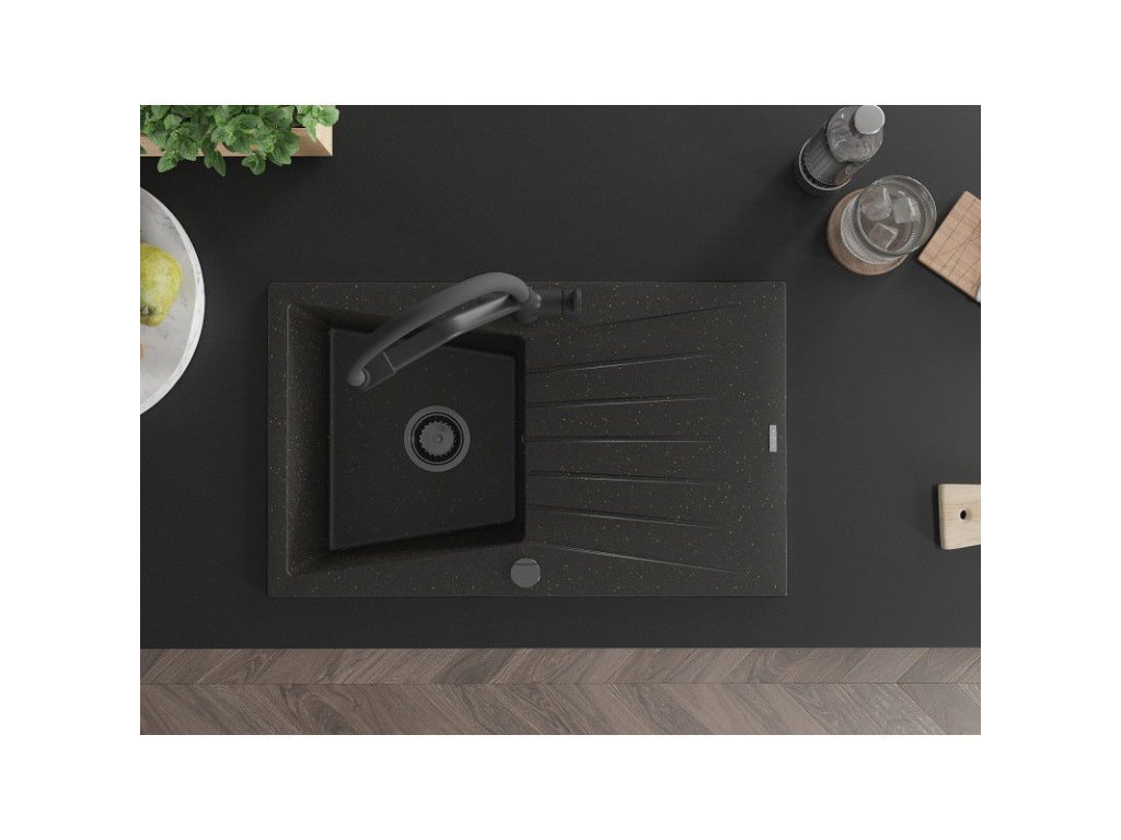 Granitový drez Mexen Cesar s 1 misou, odkapávačom a kuchynskou batériou Duo, čierna/zlatá metalíza - 6514-75-671701-70-B