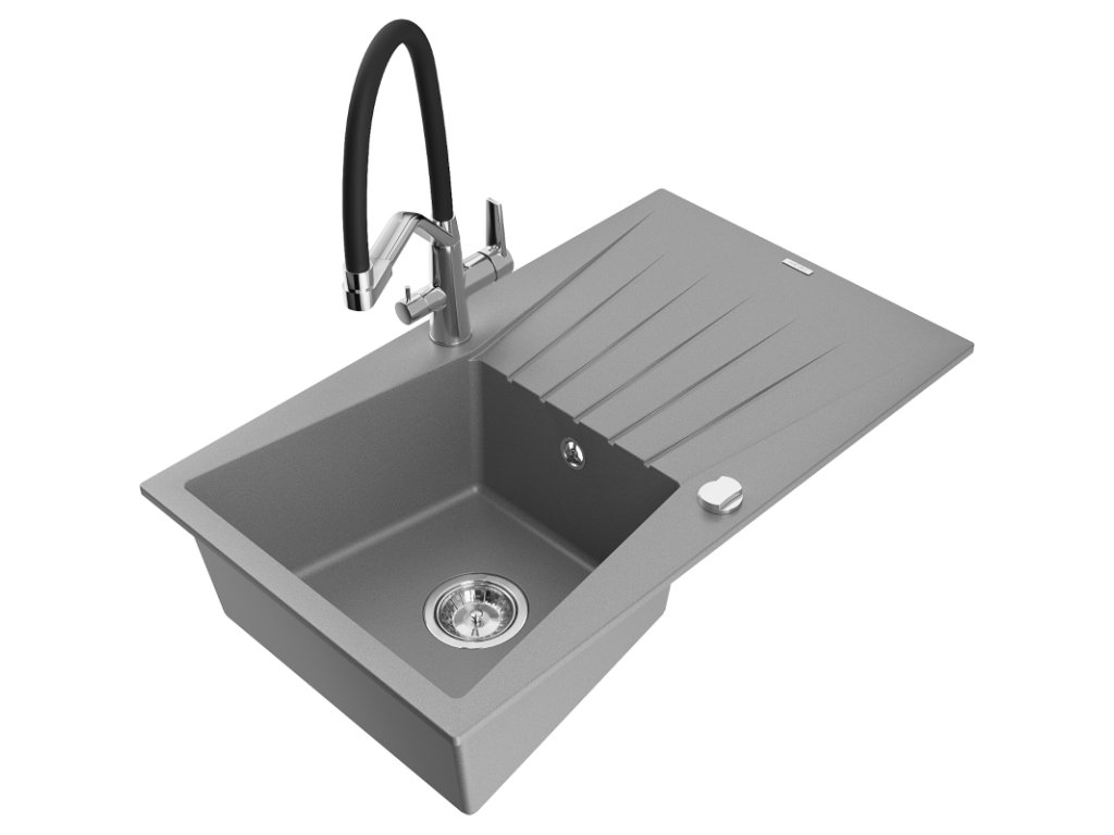 Granitový drez Mexen Cesar s 1 misou, odkapávačom a kuchynskou batériou Duo, sivý - 6514-71-671701-07