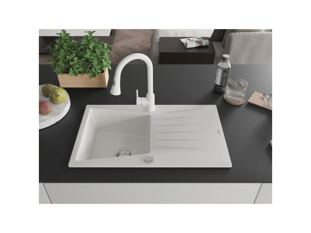 Granitový drez Mexen Cesar s 1 misou, odkapávačom a kuchynskou batériou Elia, biely - 6514-20-670101-20