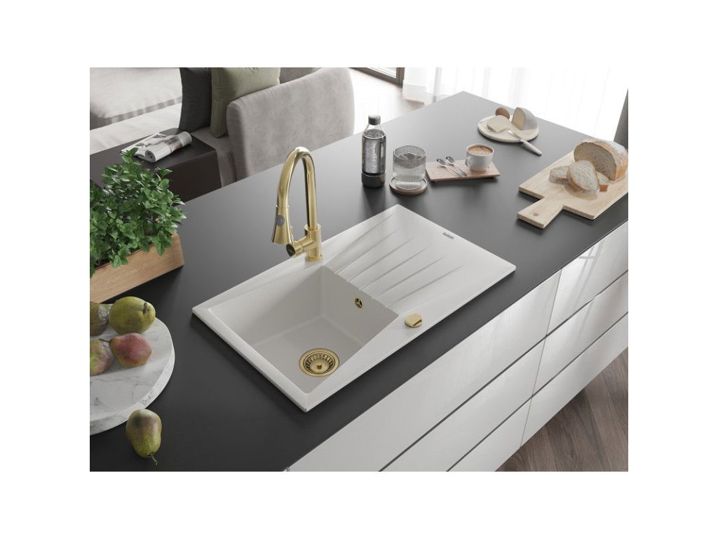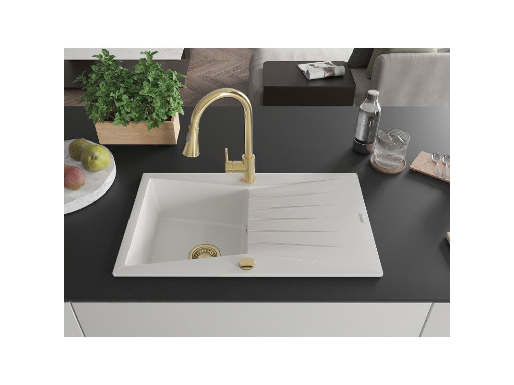 Granitový drez Mexen Cesar s 1 misou, odkapávačom a kuchynskou batériou Elia, biely - 6514-20-670101-50