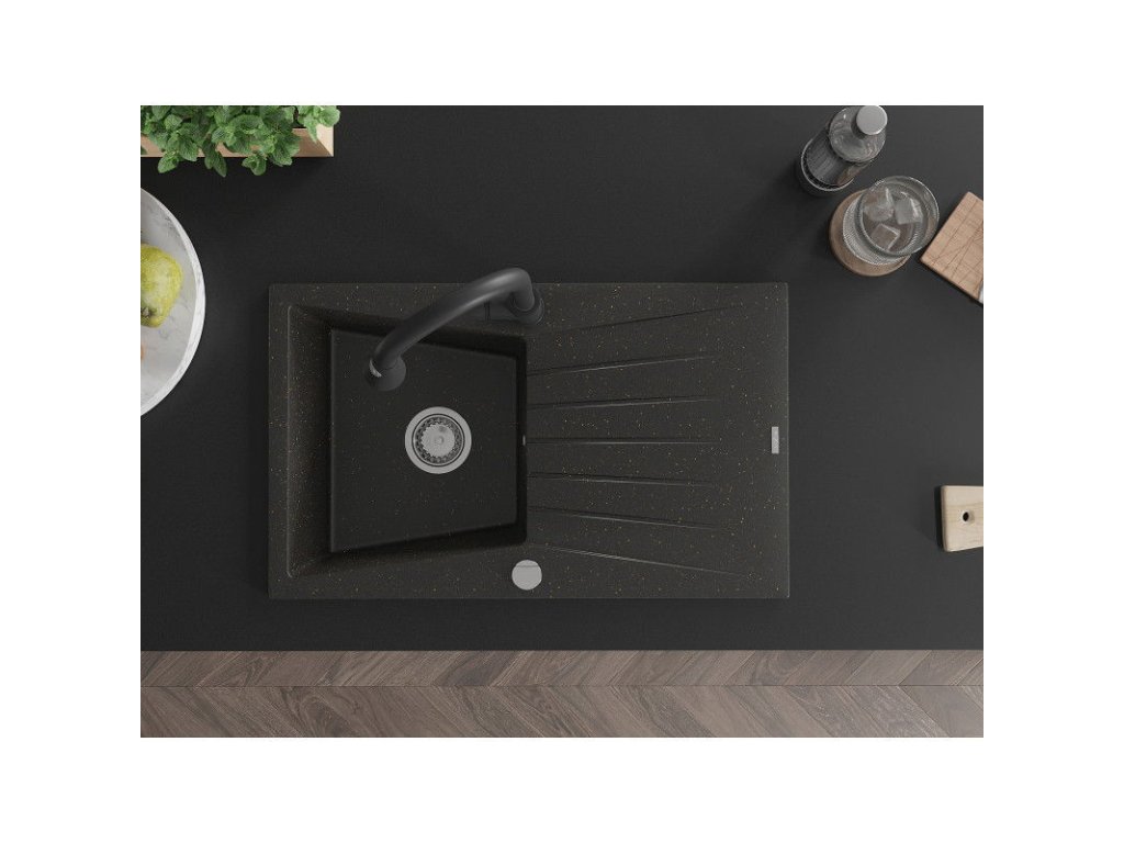 Granitový drez Mexen Cesar s 1 misou, odkapávačom a kuchynskou batériou Elia, čierna/zlatá metalíza - 6514-75-670101-70
