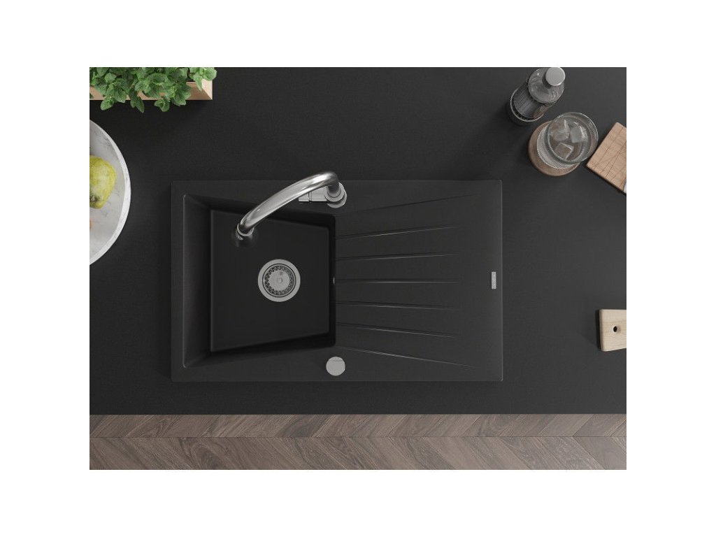 Granitový drez Mexen Cesar s 1 misou, odkapávačom a kuchynskou batériou Elia, čierny - 6514-77-670101-00