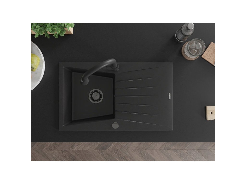 Granitový drez Mexen Cesar s 1 misou, odkapávačom a kuchynskou batériou Elia, čierny - 6514-77-670101-70-B