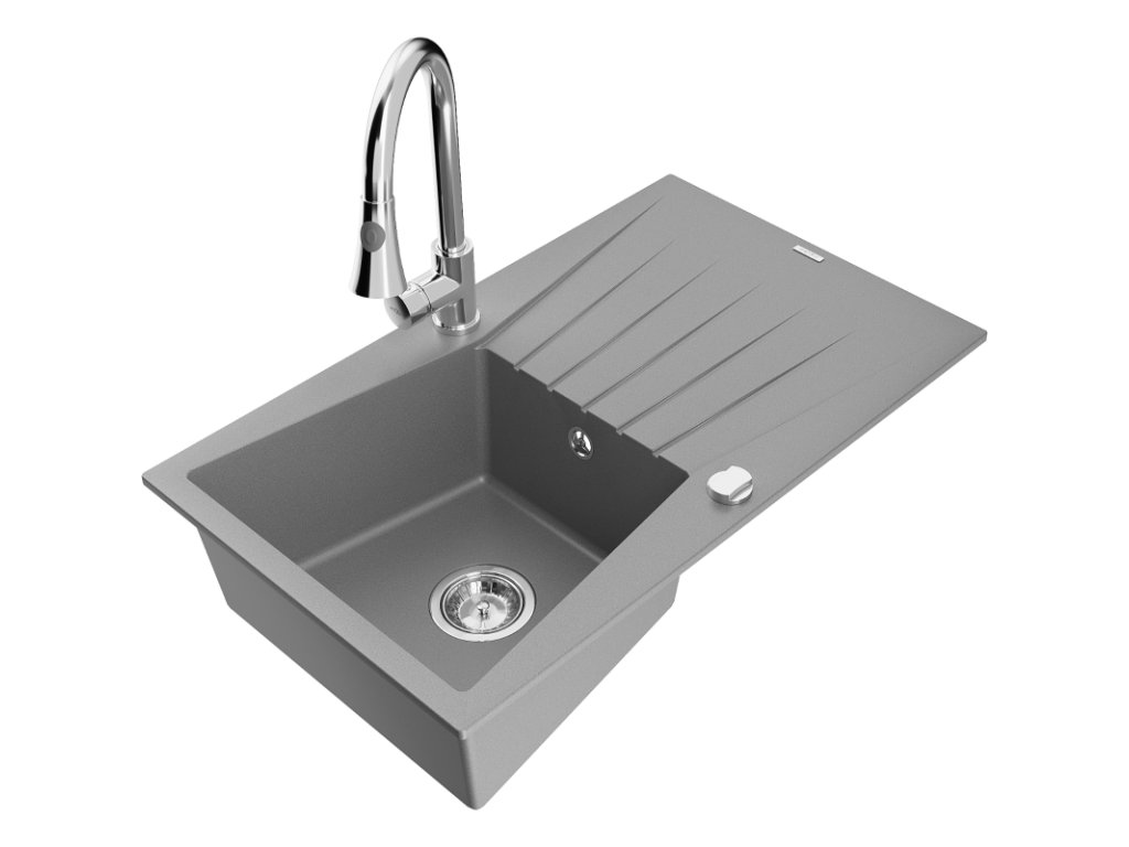 Granitový drez Mexen Cesar s 1 misou, odkapávačom a kuchynskou batériou Elia, sivý - 6514-71-670101-00