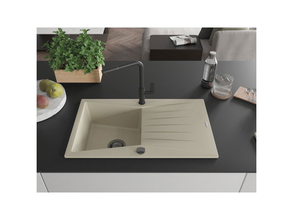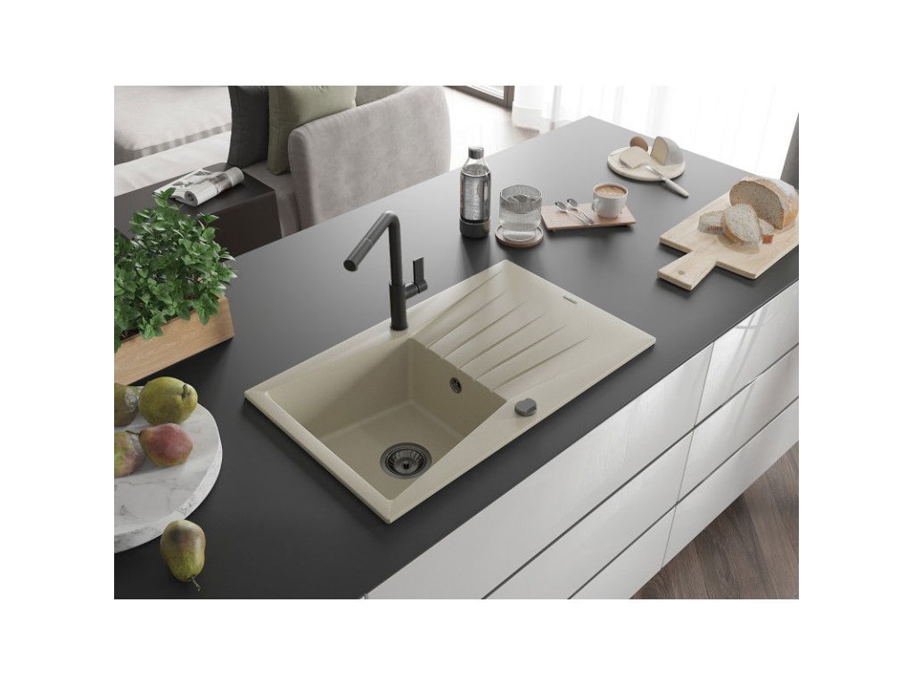 Granitový drez Mexen Cesar s 1 misou, odkapávačom a kuchynskou batériou Flora, béžový - 6514-69-670401-70-B