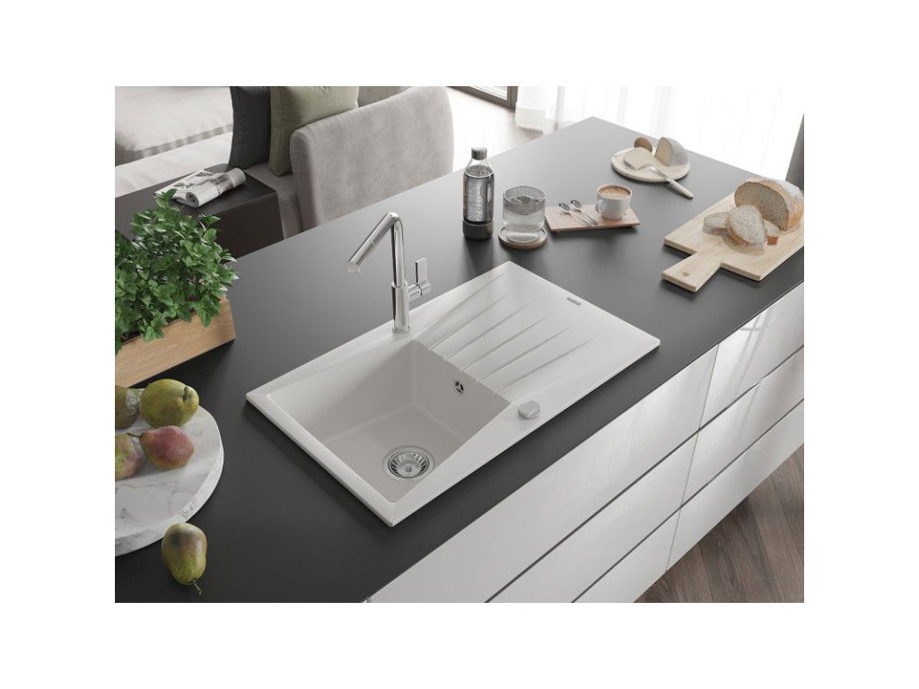 Granitový drez Mexen Cesar s 1 misou, odkapávačom a kuchynskou batériou Flora, biely - 6514-20-670401-00