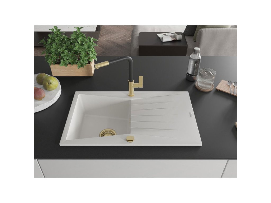 Granitový drez Mexen Cesar s 1 misou, odkapávačom a kuchynskou batériou Flora, biely - 6514-20-670401-57-G