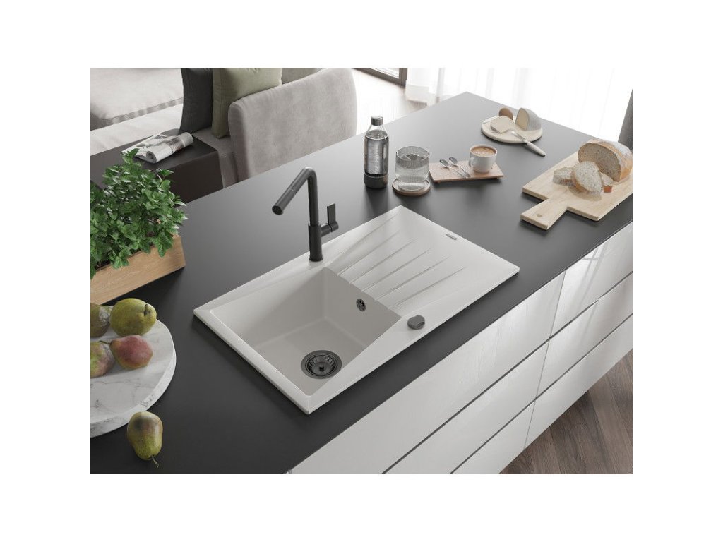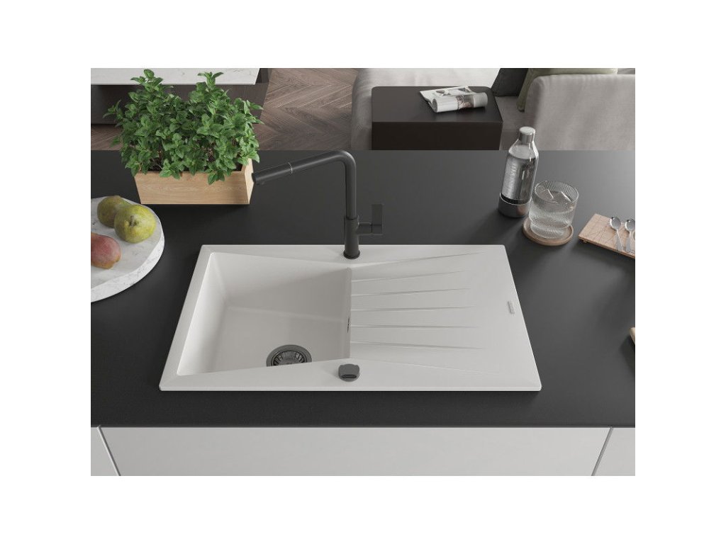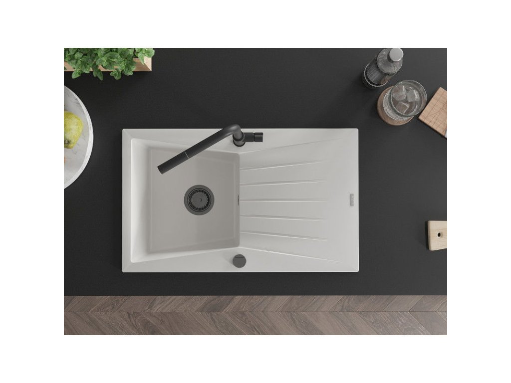 Granitový drez Mexen Cesar s 1 misou, odkapávačom a kuchynskou batériou Flora, biely - 6514-20-670401-70-B
