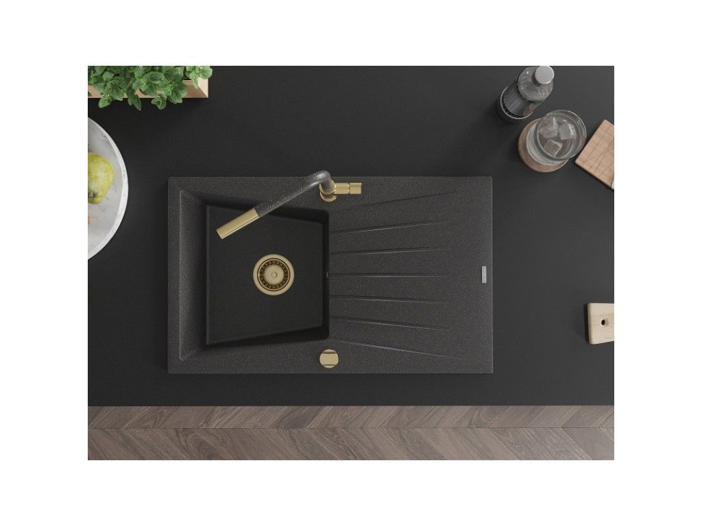 Granitový drez Mexen Cesar s 1 misou, odkapávačom a kuchynskou batériou Flora, čierna škvrnitá - 6514-76-670401-75-G