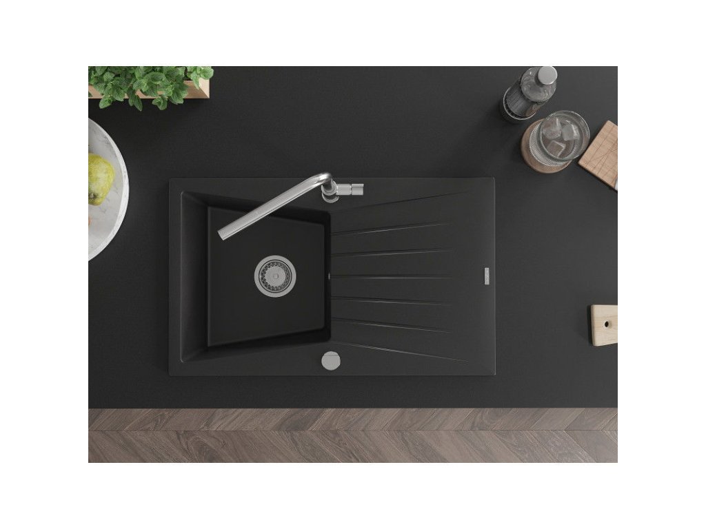 Granitový drez Mexen Cesar s 1 misou, odkapávačom a kuchynskou batériou Flora, čierny - 6514-77-670401-00