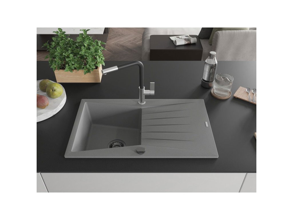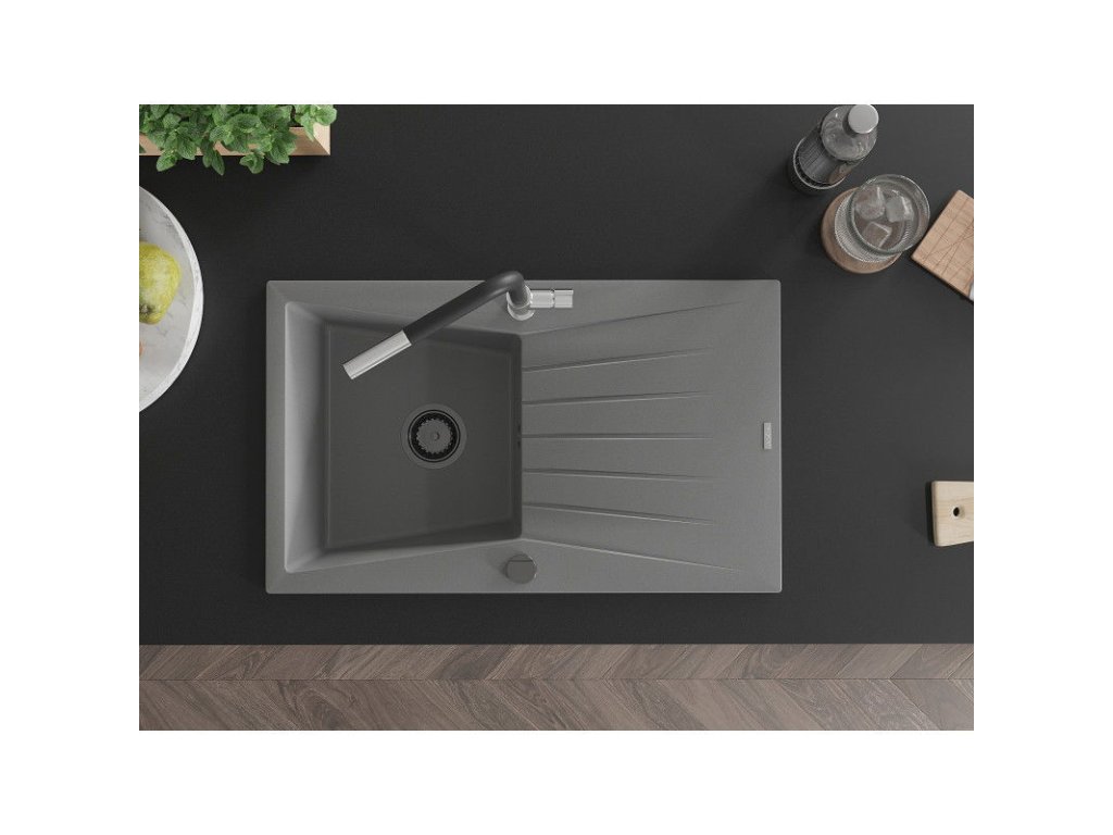 Granitový drez Mexen Cesar s 1 misou, odkapávačom a kuchynskou batériou Flora, sivý - 6514-71-670401-07-B