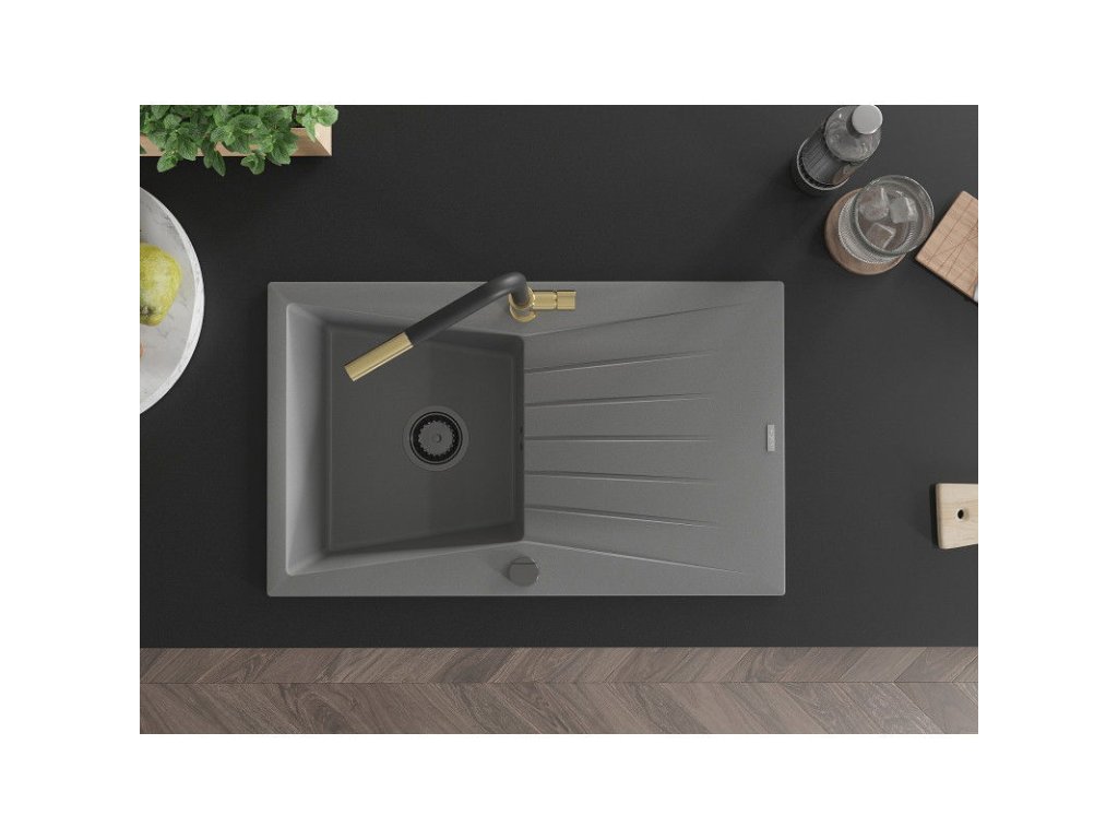 Granitový drez Mexen Cesar s 1 misou, odkapávačom a kuchynskou batériou Flora, sivý - 6514-71-670401-57-B
