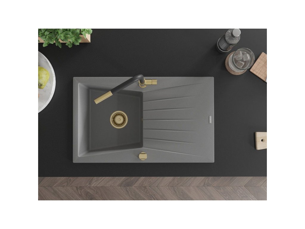 Granitový drez Mexen Cesar s 1 misou, odkapávačom a kuchynskou batériou Flora, sivý - 6514-71-670401-57-G