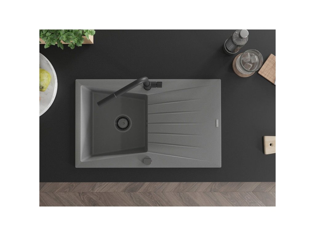 Granitový drez Mexen Cesar s 1 misou, odkapávačom a kuchynskou batériou Flora, sivý - 6514-71-670401-70-B