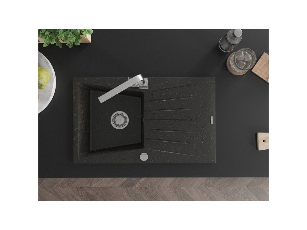 Granitový drez Mexen Cesar s 1 misou, odkapávačom a kuchynskou batériou Rita, čierna/zlatá metalíza - 6514-75-670300-00