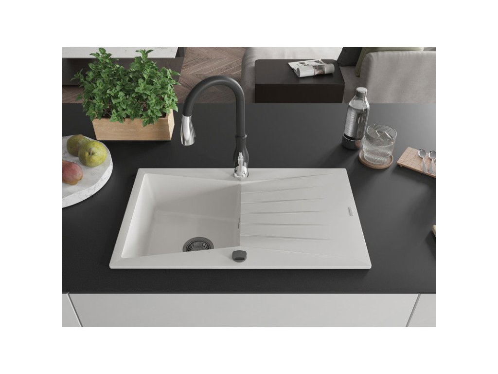 Granitový drez Mexen Cesar s 1 misou, odkapávačom a kuchynskou batériou Savita, biely - 6514-20-672601-70
