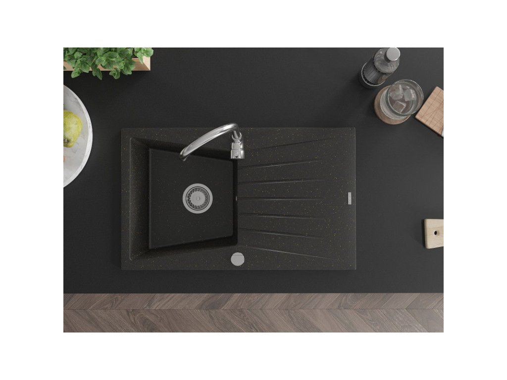 Granitový drez Mexen Cesar s 1 misou, odkapávačom a kuchynskou batériou Telma, čierna/zlatá - 6514-75-670200-00