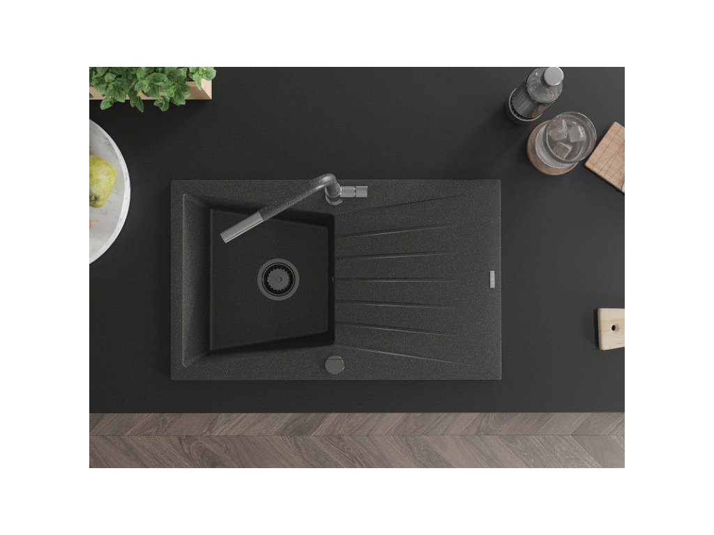 Granitový drez Mexen Cesar s 1 misou, odkvapkávačom a batériou Flora, čierna škvrnitá - 6514-76-670401-08-B