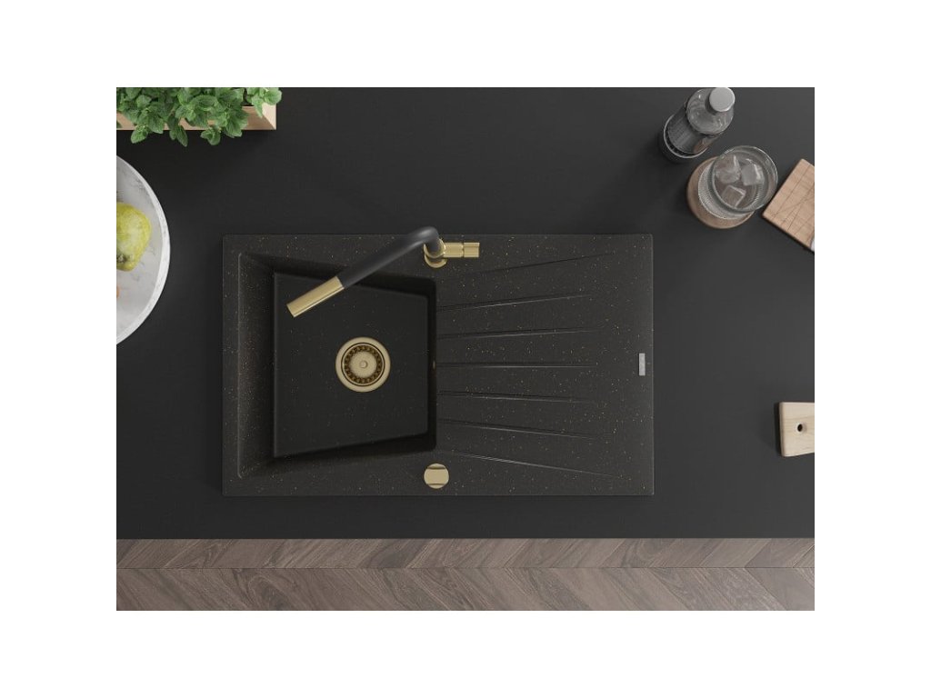 Granitový drez Mexen Cesar s 1 misou, odkvapkávačom a batériou Flora, čierna/zlatá metalíza - 6514-75-670401-57-G