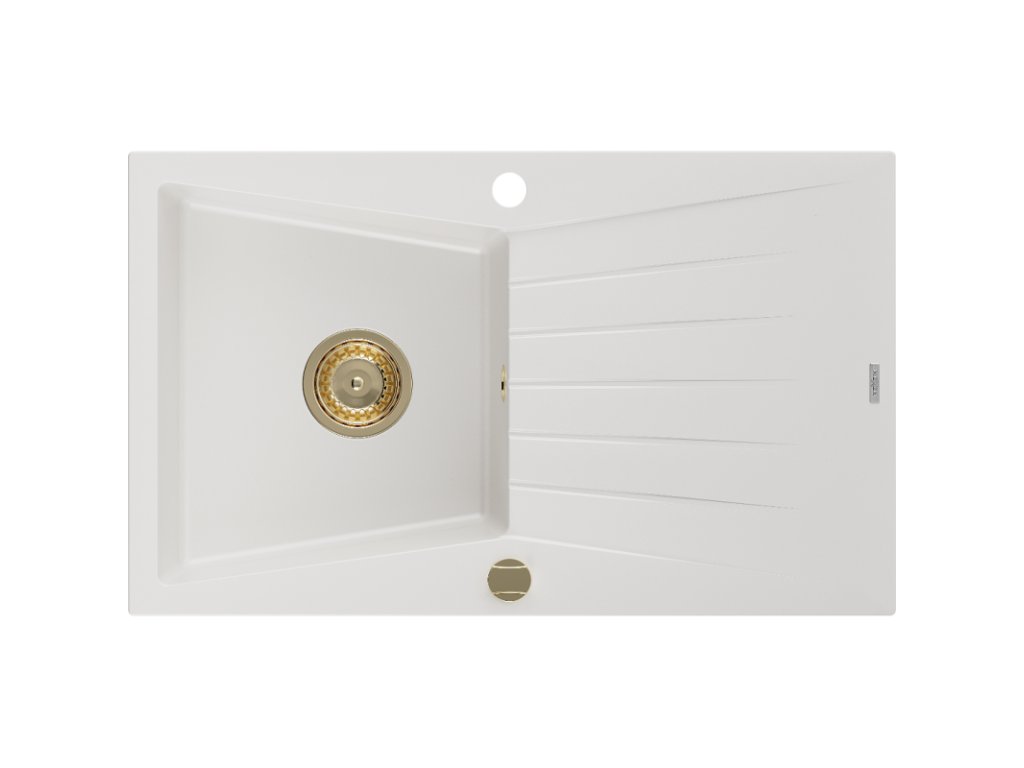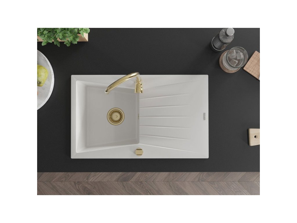Granitový drez Mexen Cesar s 1 misou a odkapávačom 775 x 470 mm, biely, zlatý sifón - 6514771010-20-G