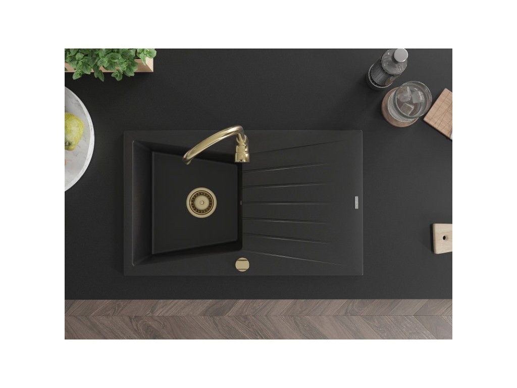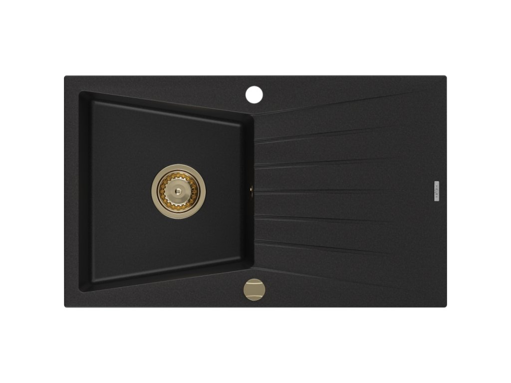 Granitový drez Mexen Cesar s 1 misou a odkapávačom 775 x 470 mm, čierny, zlatý sifón - 6514771010-77-G