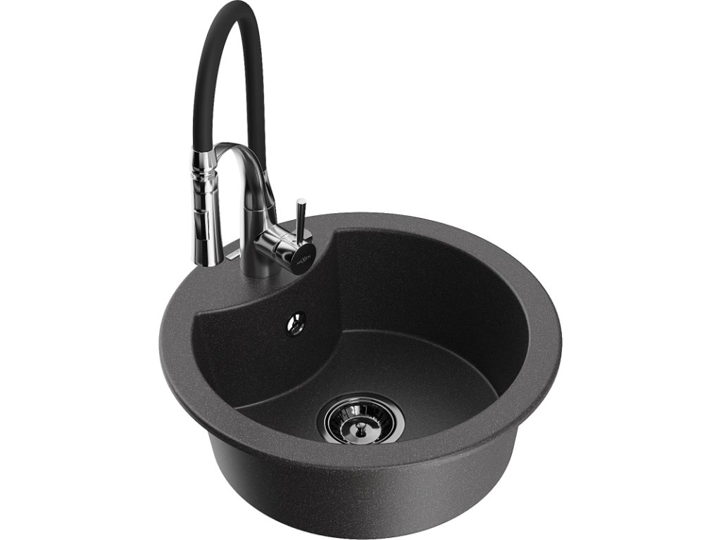Granitový drez Mexen Diego s 1 misou a kuchynskou batériou Aster, čierna škvrnitá - 6512-76-73450-07-B