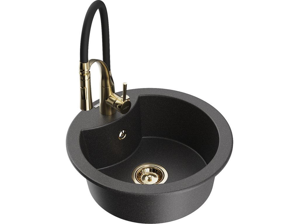 Granitový drez Mexen Diego s 1 misou a kuchynskou batériou Aster, čierna škvrnitá - 6512-76-73450-57-G