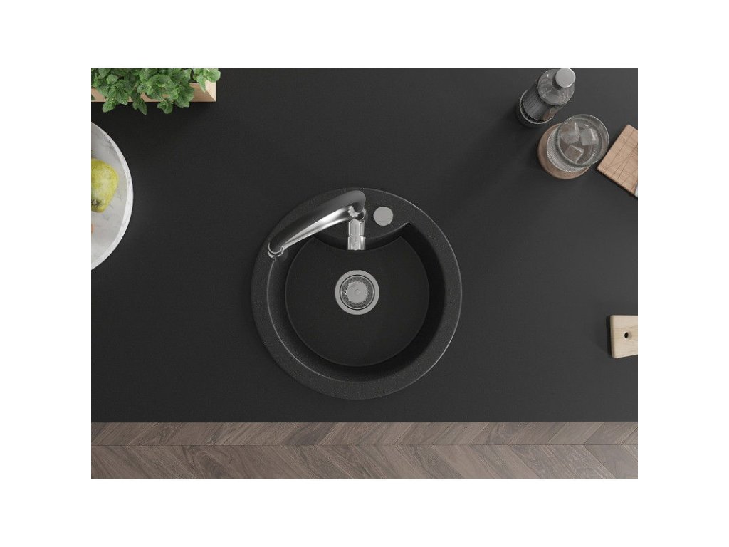 Granitový drez Mexen Diego s 1 misou a kuchynskou batériou Aster, čierna/strieborná metalíza - 6512-73-73450-07