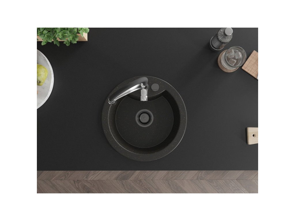 Granitový drez Mexen Diego s 1 misou a kuchynskou batériou Aster, čierna/zlatá metalíza - 6512-75-73450-07-B