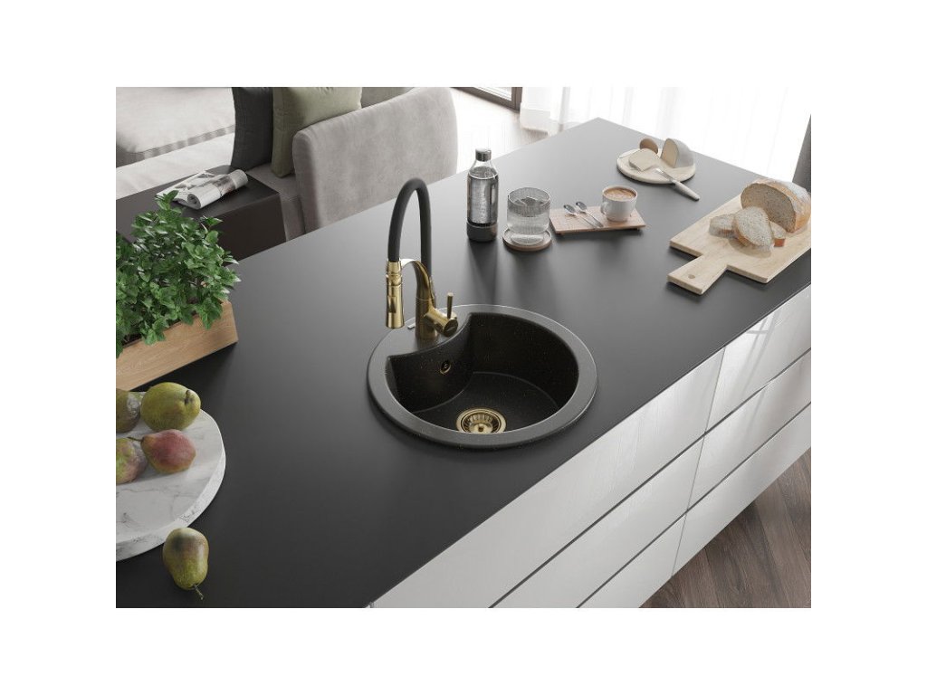 Granitový drez Mexen Diego s 1 misou a kuchynskou batériou Aster, čierna/zlatá metalíza - 6512-75-73450-57-G