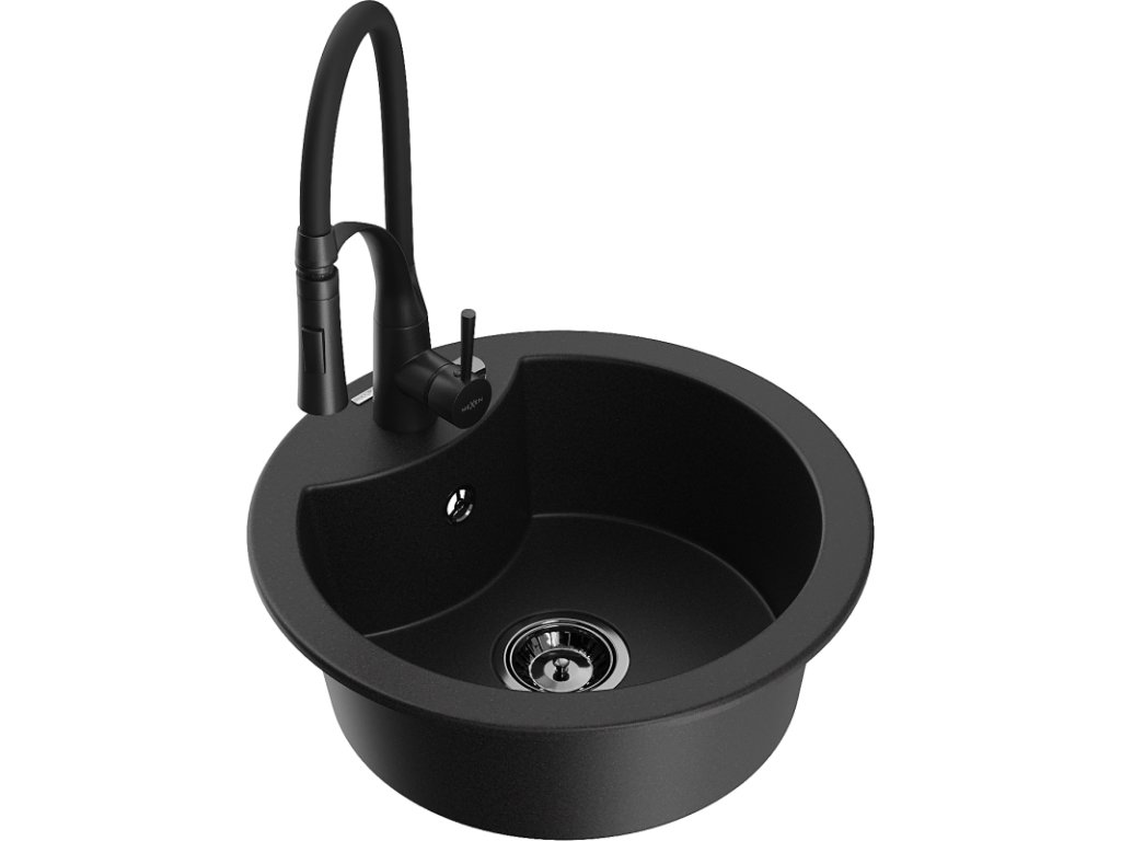 Granitový drez Mexen Diego s 1 misou a kuchynskou batériou Aster, čierny - 6512-77-73450-70-B