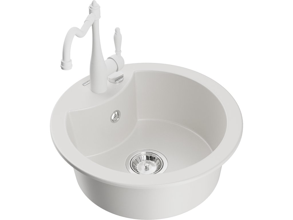 Granitový drez Mexen Diego s 1 misou a kuchynskou batériou Carla, biely - 6512-20-670700-20