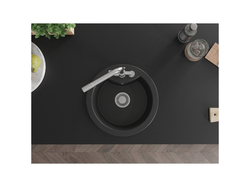 Granitový drez Mexen Diego s 1 misou a kuchynskou batériou Duero, čierna/strieborná metalíza - 6512-73-671600-00