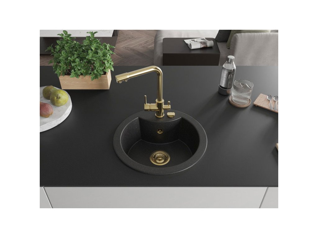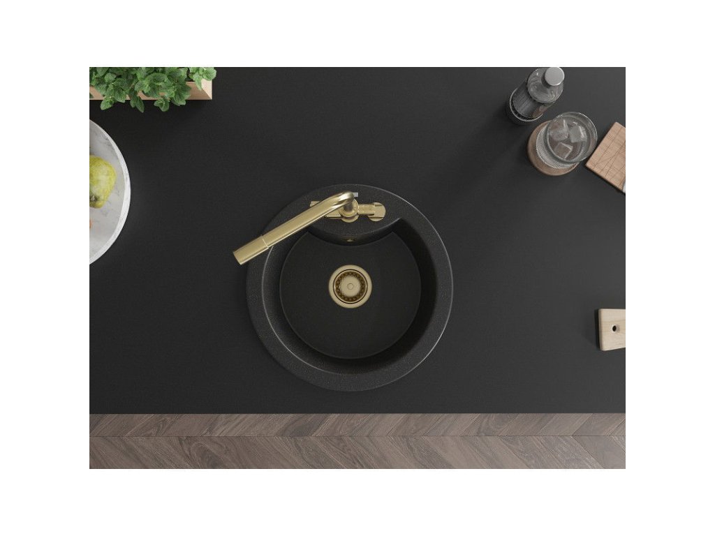 Granitový drez Mexen Diego s 1 misou a kuchynskou batériou Duero, čierna/strieborná metalíza - 6512-73-671600-50
