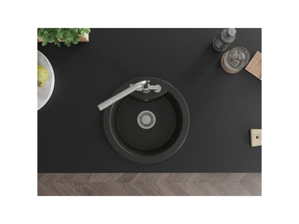 Granitový drez Mexen Diego s 1 misou a kuchynskou batériou Duero, čierna/zlatá metalíza - 6512-75-671600-00