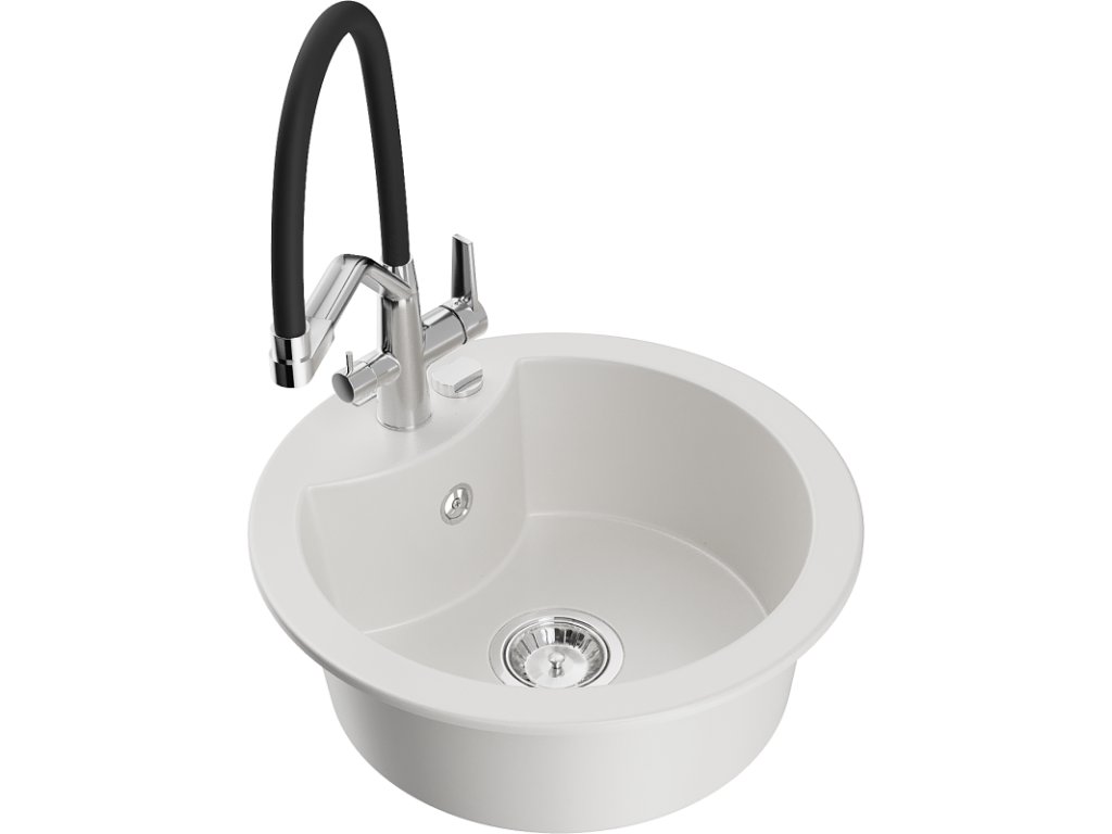 Granitový drez Mexen Diego s 1 misou a kuchynskou batériou Duo, biely - 6512-20-671701-07